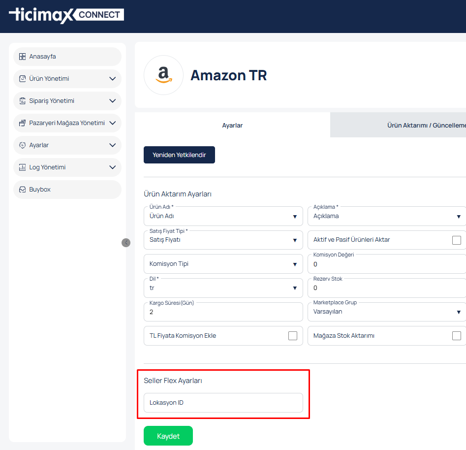 Amazon pazaryerine tıkladığımızda yer alan "Ayarlar" bölümünde "Seller Flex Ayarları" alanı sisteme eklenmiştir.