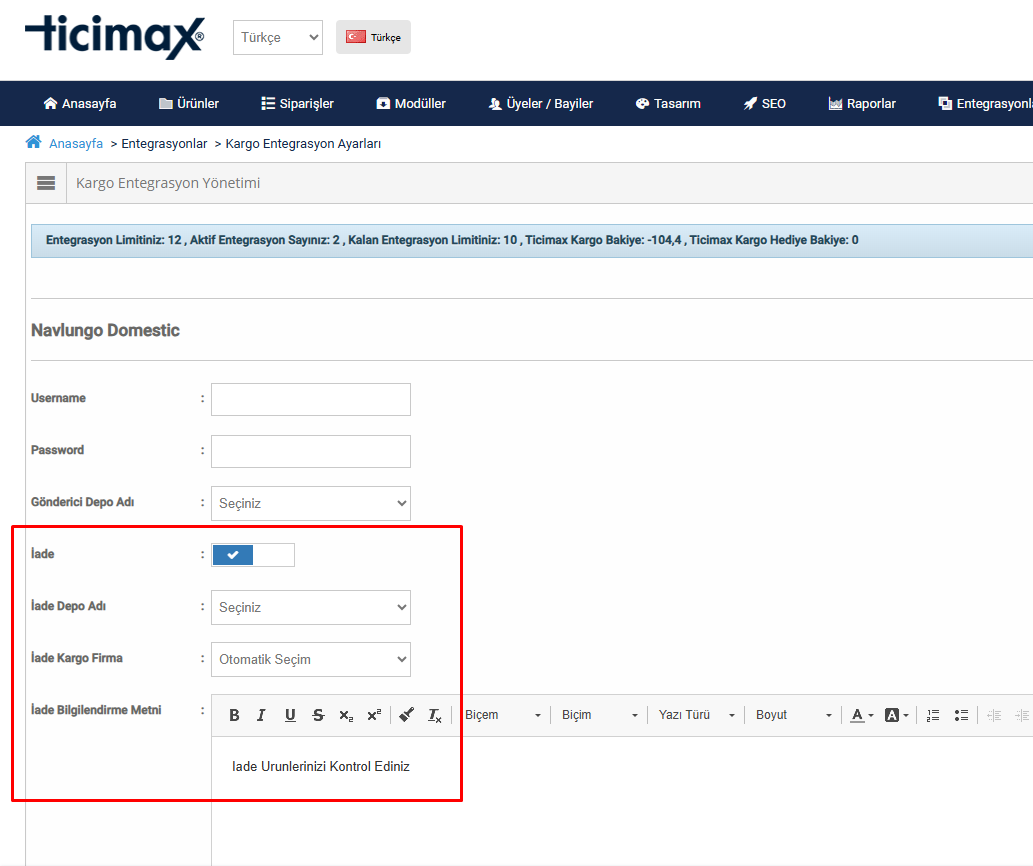 Ticimax admin panelinizde Entegrasyonlar > Kargo Entegrasyon Yönetimi alanında "Navlungo Domestic" tanımlı kargonun düzenleme alanına girerek İade ayarlarınızı yapılandırabilir ve kullanıma aktif hale getirebilirsiniz.